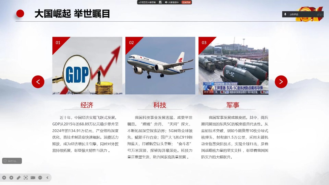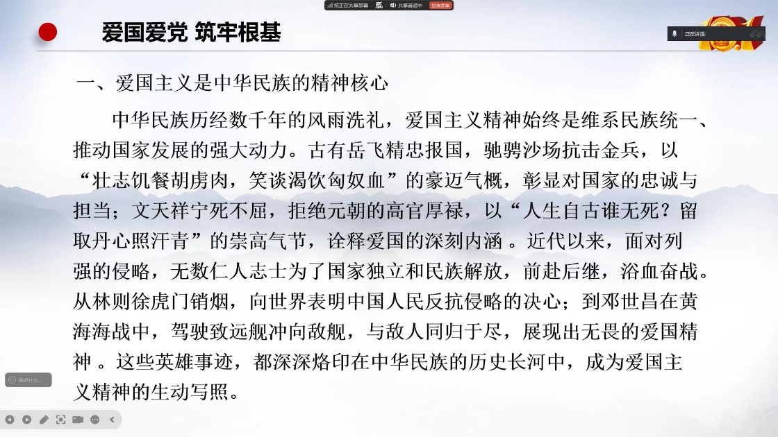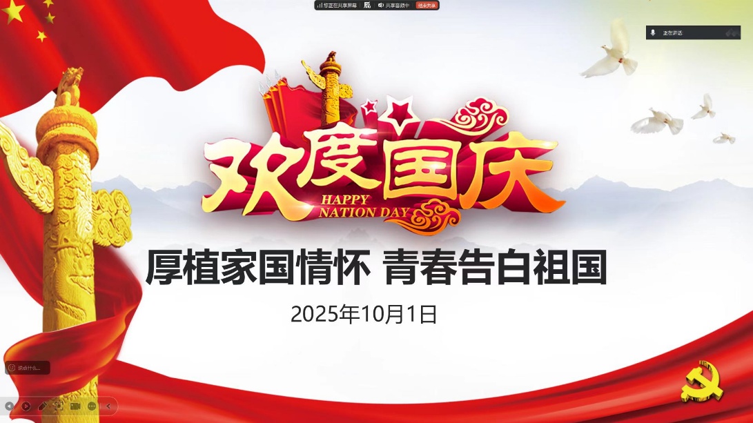 会议开始,党日活动负责人首先结合PPT,分维度讲解国家近十年发展成果:经济领域聚焦GDP增长数据与产业结构优化,科技领域以“嫦娥”“天问”“C919”“奋斗者号”为案例,重点解读东风5C洲际导弹的技术参数与战略意义。接着,又开展了“爱国爱党 筑牢根基”主题爱国主义教育,通过专题宣讲和视频观看的形式,引导党员们厚植爱国情怀,强化党性修养。会议之后,党员们展开热烈的交流,分享最触动自己的国家成就,其中一名党员提到让他印象最深的是“移动支付!食堂吃饭刷脸就付、寄快递在手机上点几下就可以,无不显示我们国家的强大。”活动以“我在家乡告白祖国”的形式结束。党员们在各自家乡录制视频,他们用镜头记录下家乡的风貌,再配上一句句真挚的祝福。这些来自各地的视频,虽然画面不同,但都饱含着对祖国母亲最深切的热爱和最美好的祝愿。最后,赵春江老师总结道:“每段短视频里的朴实话语,都是对‘爱国’最生动的诠释,希望大家把这份热忱藏进日常,用行动续写对祖国的告白。”