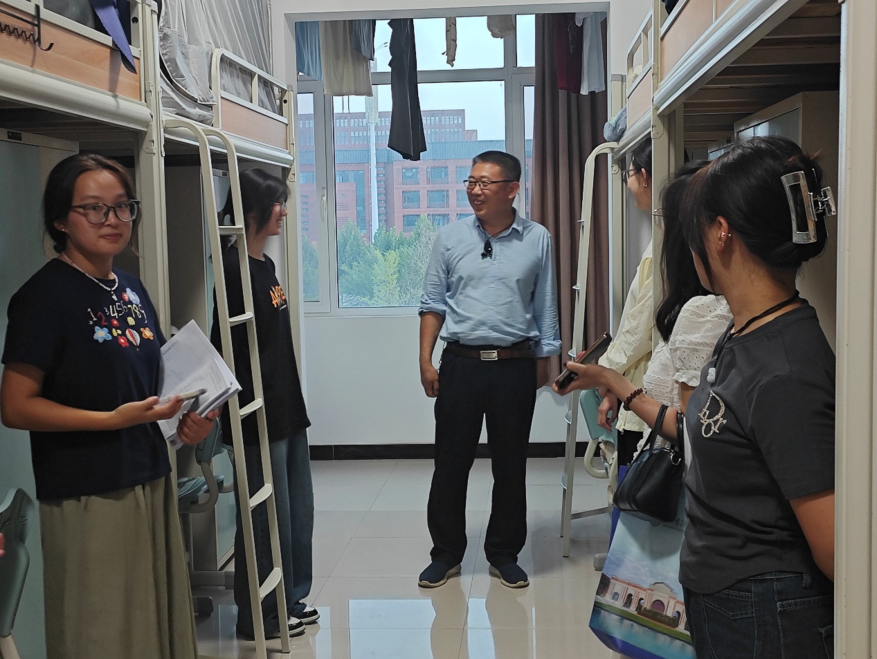 活动当日,赵春江老师亲切地与新生交谈,详细询问大家的住宿环境适应情况、饮食作息安排,耐心倾听新生在生活习惯方面遇到的困惑与问题,同时,结合近年大学生频繁遭遇诈骗的情况,提醒新生需保持警觉、强化防范意识,让安全意识深入新生内心,引导大家保持宿舍环境整洁有序,养成良好的生活习惯,并鼓励新生们在日常生活中互帮互助,建立和谐融洽的宿舍关系,共同营造安全、舒适、积极向上的住宿氛围。辅导员们围绕宿舍安全核心要点,向同学们开展细致讲解与现场提醒。针对宿舍用电安全,赵春江老师明确强调“人走灯灭”的用电准则,要求大家养成节约用电习惯,同时提醒新生严禁将大功率电器等违禁物品带入宿舍,引导大家共同维护宿舍消防安全环境。不少新生表示,此次走访让自己感受到了学院大家庭的温暖,缓解了初入校园的陌生感,也对未来的大学生活有了更清晰的规划。